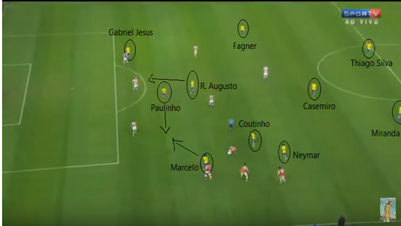 O lateral varia entre um zagueiro-interior e um ponta que ataca o espaço-vazio, ou mesmo um armador mais adiantado. E no centro do campo há duas figuras: o mezzala e o regista. Renato Augusto é o regista, compensando os movimentos dos outros, juntando a equipe e dando ritmo a ela. Paulinho é o mezzala, fazendo saída sustentada e atacando entrelinhas, como também se movimentando para entrar na área ou no espaço-vazio. Do mesmo modo, Tite usa sempre numa ponta um cara para fazer a função de ponta-armador, tendo total liberdade para flutuar no último terço ofensivo. O outro ponta é um segundo atacante, que deve ser vertical e buscar o gol. Em geral, contra o Uruguai, Coutinho foi o segundo atacante e Neymar o ponta-armador. Contra o Paraguai, Coutinho foi o ponta-armador e Neymar o segundo atacante. Mas, durante o jogo, essas mesmas funções cambiaram de lado.